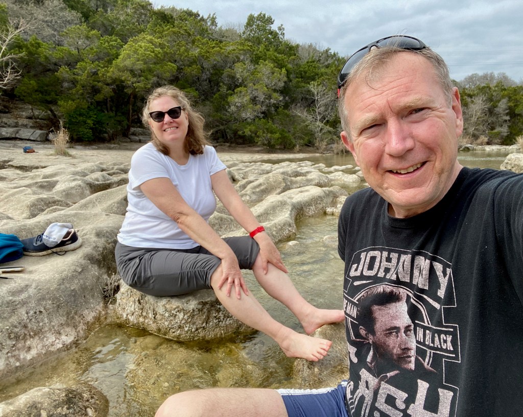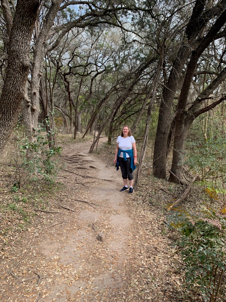 One Monday we walked 3.2 miles round trip to Sculptured Falls in the Barton Creek Greenbelt. This city recreation area follows the creek through a rocky gorge. Some of the creek bed is dry, but other places are flowing with clear, spring-fed water. It was at the falls that the 14-year-old still in me found a good swimming hole and a rock ledge perfect for jumping in.