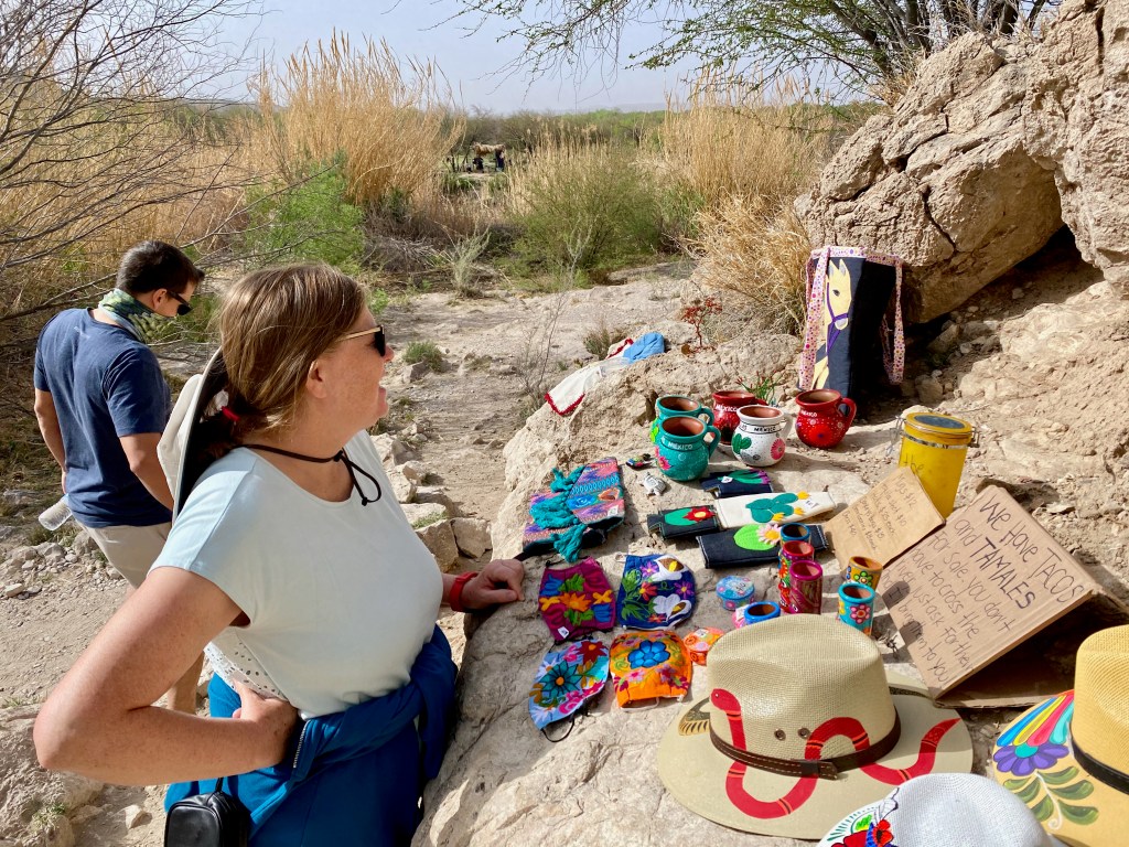 On this hike and the trails near our campground, you can see an assortment of souvenir artifacts left in certain spots along the trail–such as ceramic cups, bead bracelets, wire and bead figures of scorpions–with a cup nearby to place your money if you buy something. On the Boquillas Canyon trail you can also buy tacos or tamales from the small group of Mexicans waiting just on the other side of the river. A small sign said they will deliver the food.