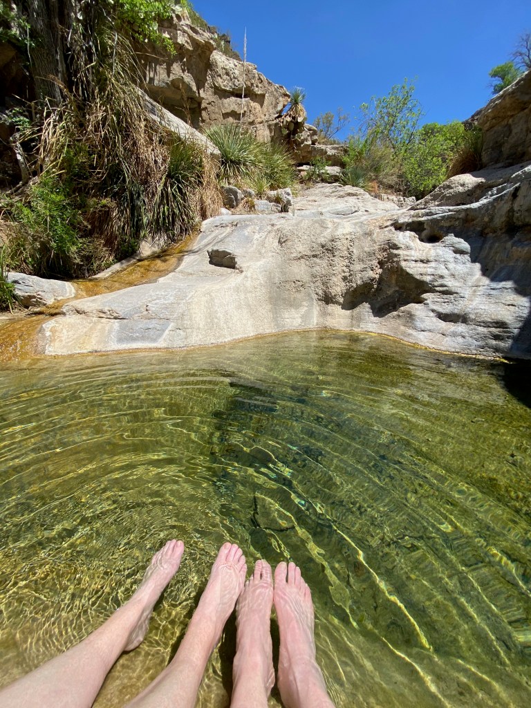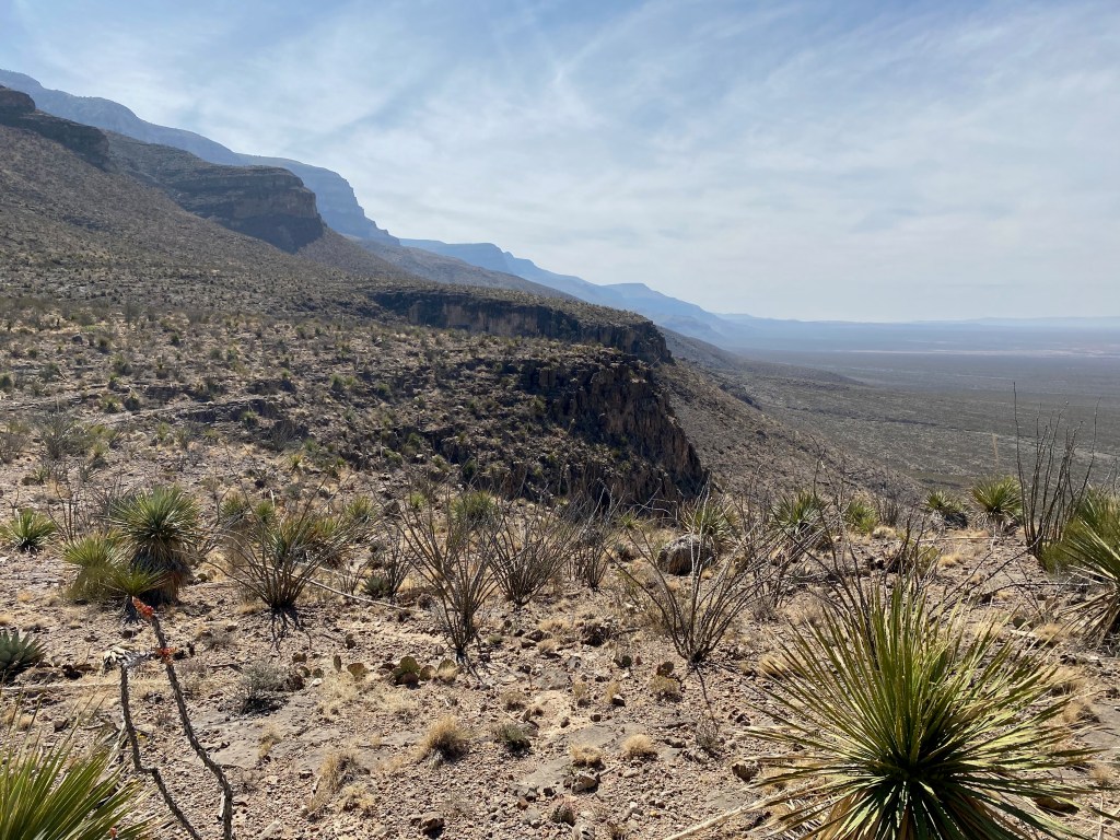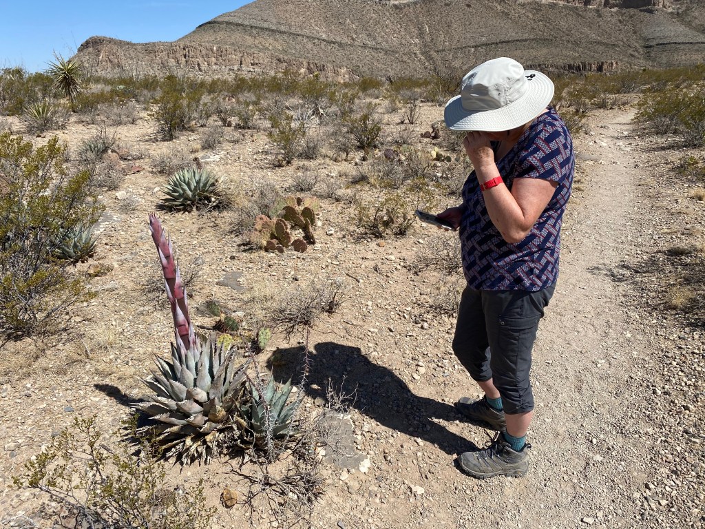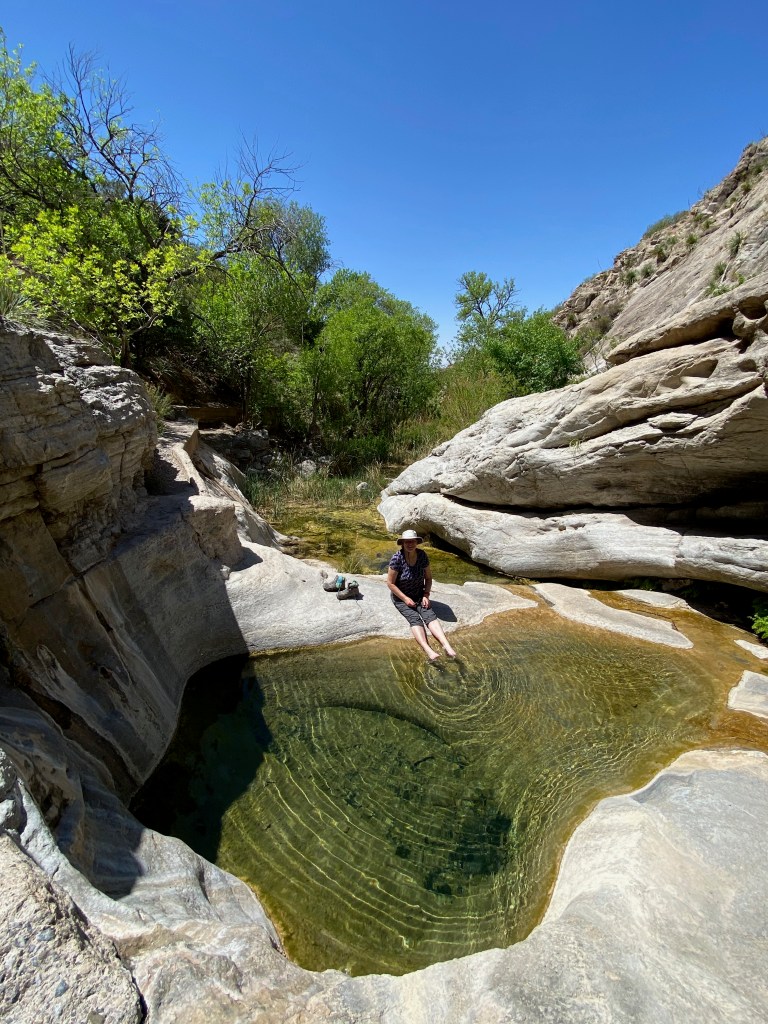 We started our excursion in the park with a 2.5-mile roundtrip hike up and along the side of Dog Canyon. Elizabeth continued her study of desert plants along the trail, and we both enjoyed the views back down the canyon to the valley floor. Our labors were rewarded back near the visitors center when we hiked a short way into the canyon to a spring-fed oasis. We enjoyed soaking our feet in a pool of clear, cool water, shaded by the surrounding cottonwood trees and other plants.