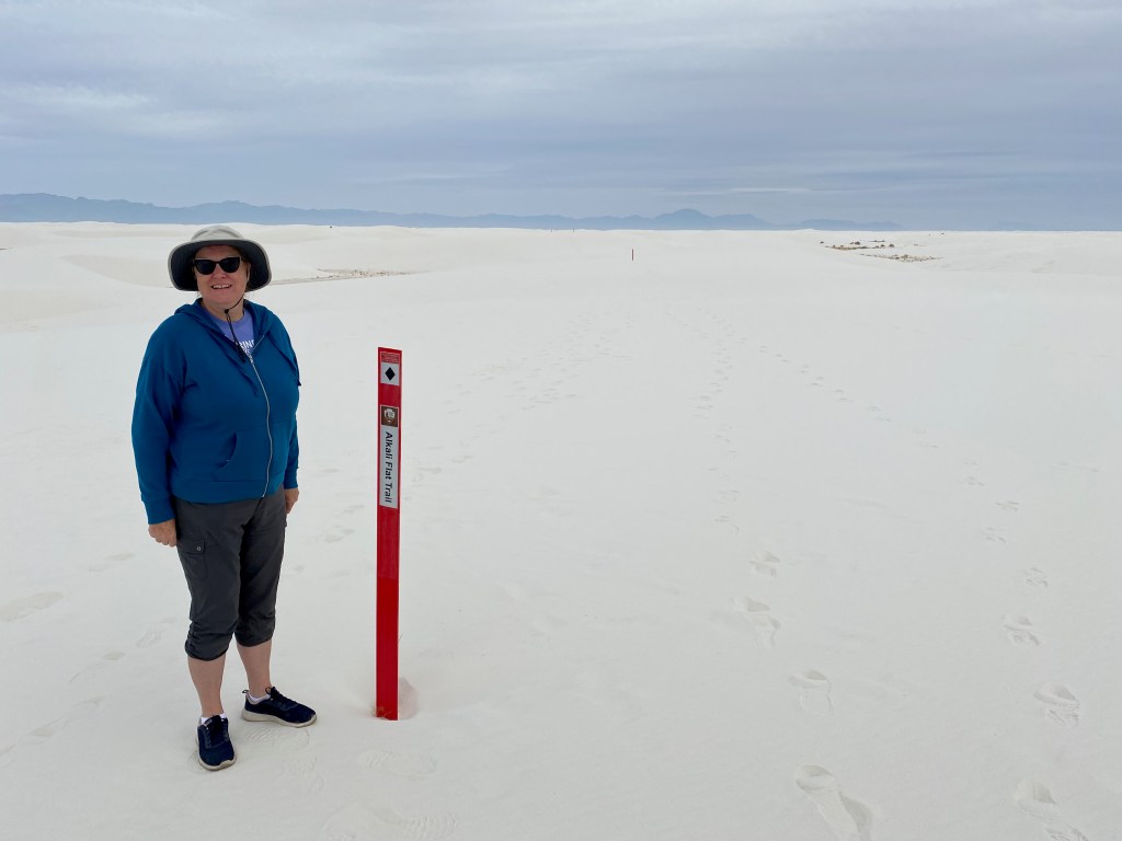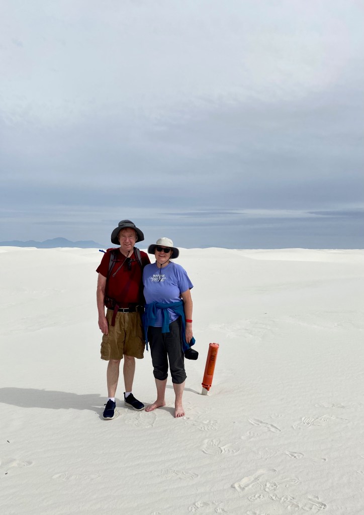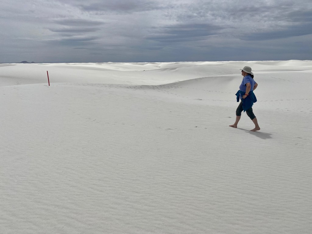 ALAMOGORDO, NM – Today we hiked through the gigantic 176,000-acre sandbox known as White Sands National Park. We walked for five miles over dunes mostly in our bare feet on the Alkali Flats Trail, the main excursion in the park.