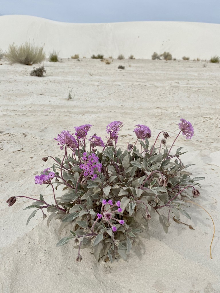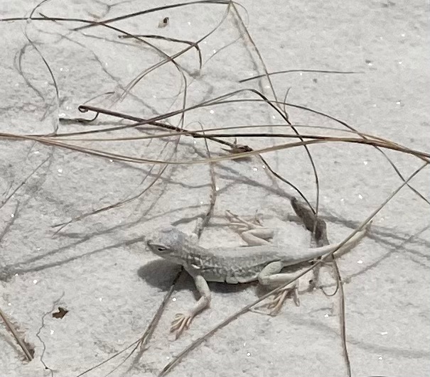On our walk, we saw a beetle scurrying across the sand and a “bleached earless lizard,” which I understand is neither of those adjectives! We labored up the soft side of the sand dunes, but enjoyed sinking our feet in the cool sand on the downward slopes. Because the gypsum sand is white, it reflects the sunlight and stays cool. It’s also moist just beneath the surface because of the high water table, which tends to anchor the dunes and offer further delight for the feet of hikers.