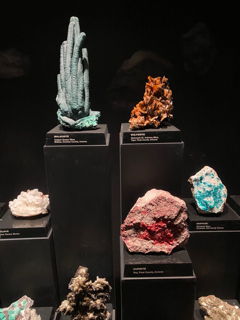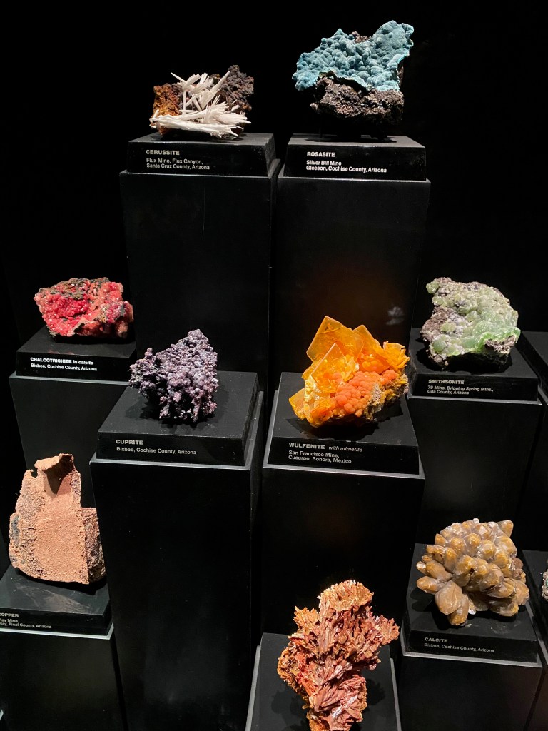 Among the highlights that you shouldn’t miss at the museum is the hummingbird aviary, where we were able to watch three of the little birds flit around us. I was especially impressed with the mineral collection, which I thought rivaled that of the Smithsonian’s Natural History Museum in Washington. The museum’s display was all the more impressive because almost all the colorful rocks were mined in Arizona or in nearby Mexico. (See photos below.)
