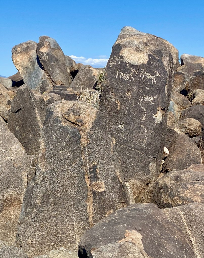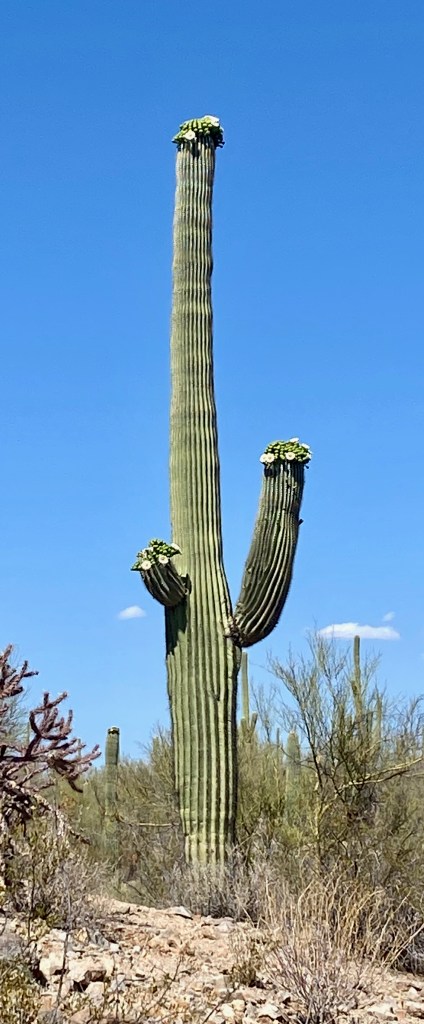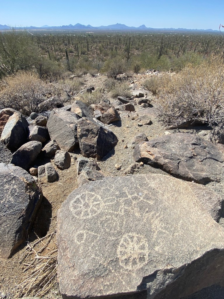 In Saguaro National Park, time limited us to the West section. We drove the 5-mile Bajada Loop through a forest of saguaro (pronounced suh-WAH-row) cacti. We hiked for a mile or so on the Cactus Wren and Wild Dog trails, surrounded by the towering stick figures known as the “sentinels of the desert.” At the visitor center we learned that the saguaro can grow to 40 feet or higher and only start sprouting arms at age 70. They are found in large numbers only in this part of the Sonora Desert. Toward the end of the loop we climbed a third of a mile to the top of Signal Hill to view petroglyphs created by the Hohokam Indians who lived in the area between 450 and 1450 AD.