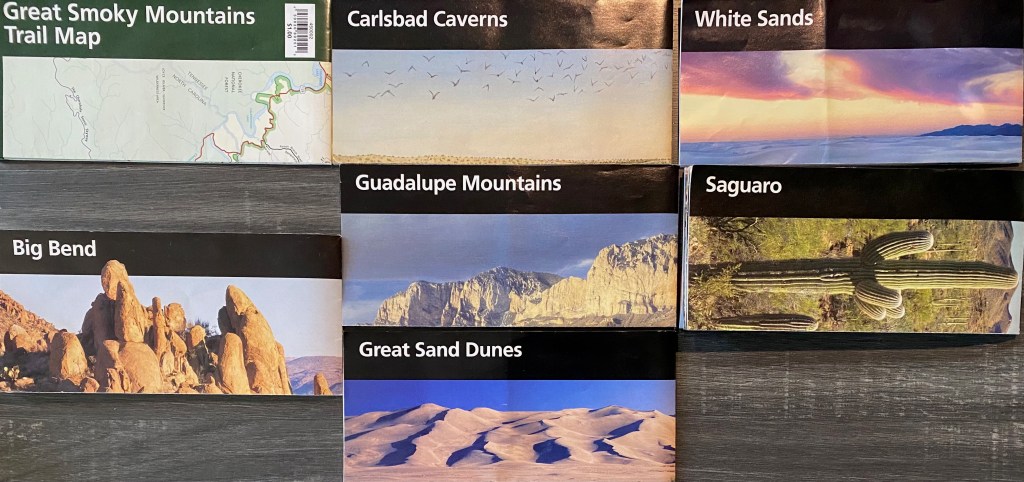 Saguaro marks the eighth national park we’ve enjoyed since we began our trip in early February. Seeing as many national parks as we can has been a kind of organizing principle of our itinerary. Lord willing, by the time we see Yellowstone N.P. in early July, we will have visited 20 national parks! (Here’s a montage of my trophies, minus the brochure for Hot Springs N.P. in Arkansas, which I must have absent-mindedly discarded along the way.)