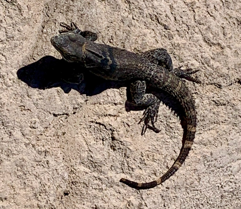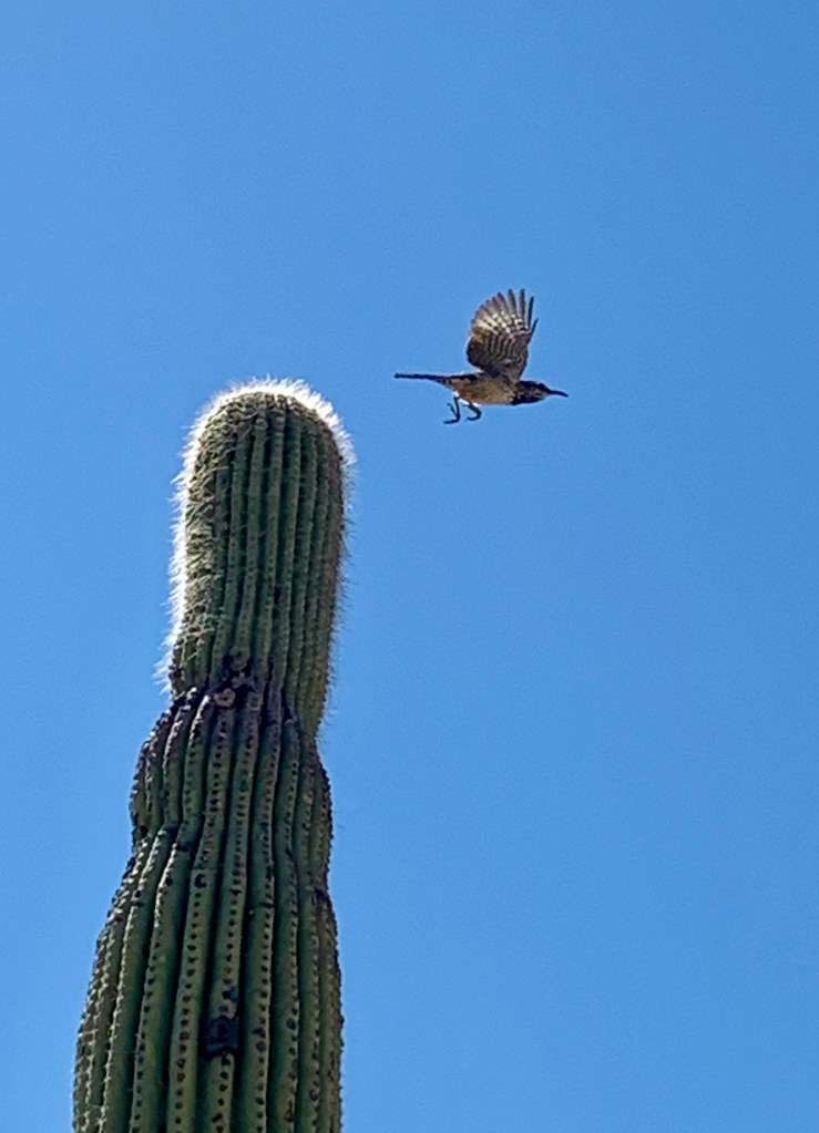 At the museum you can also see wildlife that would be much more rare to see in the park. We saw javalinas sleeping under a pedestrian bridge, a black bear, lots of rattlesnakes safely behind glass, a beaver, a large lizard sunning itself on a rock, and Mexican gray wolves. Elizabeth took the photo of the bird taking off from atop a saguaro cactus, and the coyote was on the road just outside the museum as we were leaving.