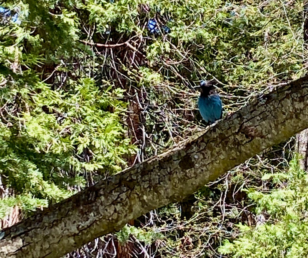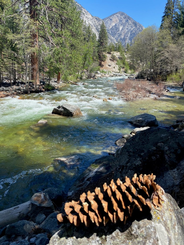 Here are a few photos from Kings Canyon N.P.: 1) The General Grant Tree; 2) Roaring River Falls; 3) along the South Fork of the Kings River; 4) Looking up river–with a huge pine cone I placed on a rock for perspective and color; 5) This bird waited patiently on a limb above Muir Rock, and was rewarded when a couple nearby left a cracker out for the bird to snatch; 6) On Muir Rock looking up river. Right behind me was a popular jumping off point for swimmers.