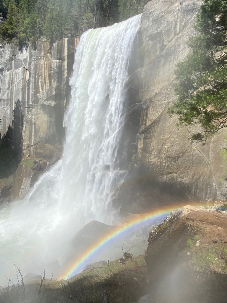 The 3-mile roundtrip trail starts at the Yosemite Valley floor along the Merced River. It rises about 400 feet to a footbridge over the river looking up at the falls, and then another 600 feet to a viewing area above the falls. For the final ascent, I trudged up a granite stairway of more than 600 steps. The stairway and I were both soaked from the spray from the falls but the mist also created a colorful rainbow at its base.