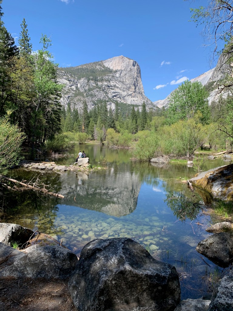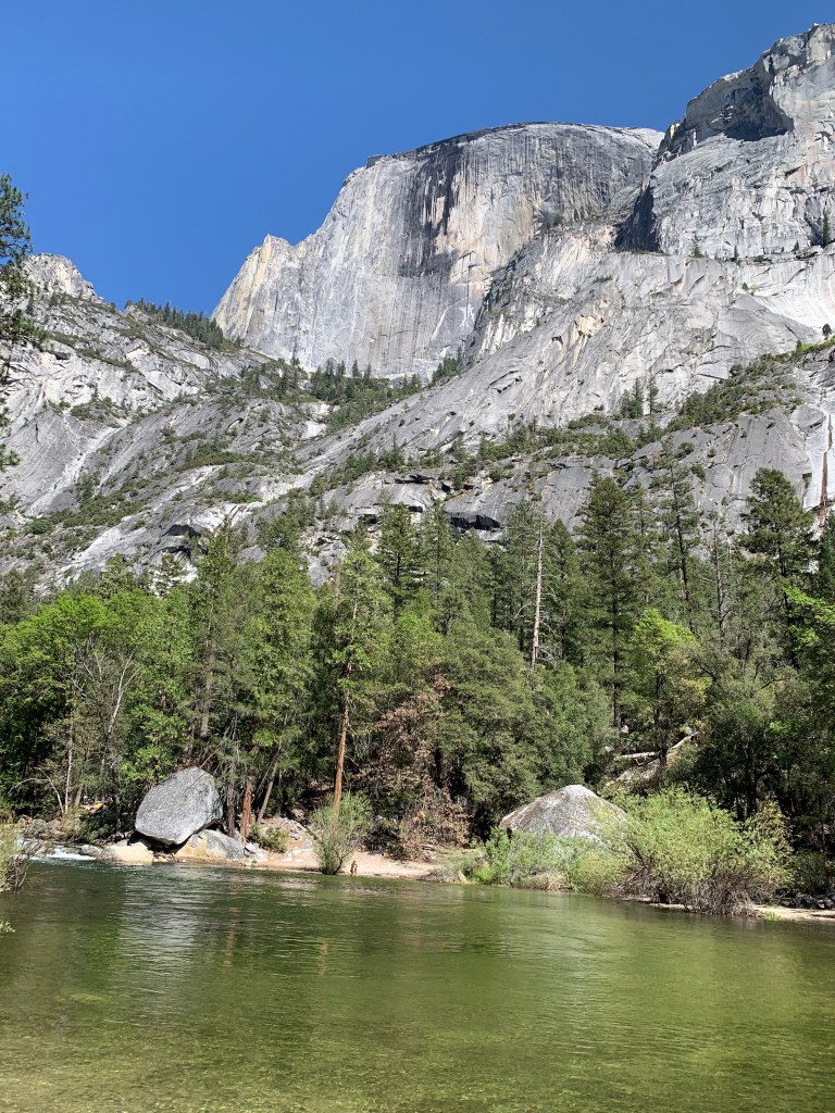While I was getting a shower on the Mist Trail, Elizabeth was walking to Mirror Lake at the base of Half Dome. It’s not really a lake, but a wide and slow-moving portion of Tenaya Creek. It’s a great place for kids to wade in the creek and for reflective photos of Half Dome. Here are a couple of Elizabeth’s photos.