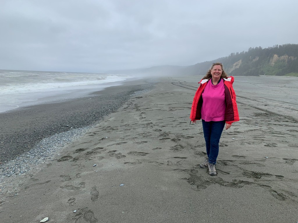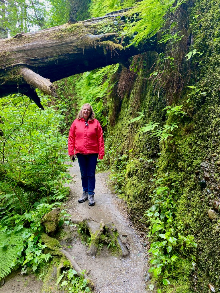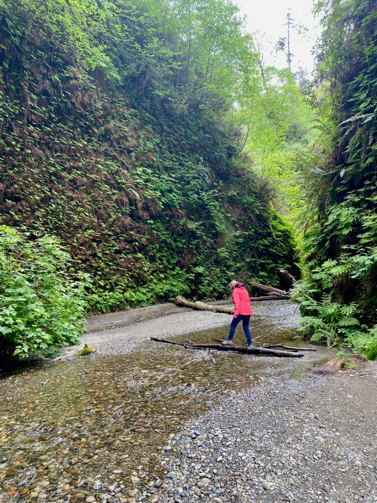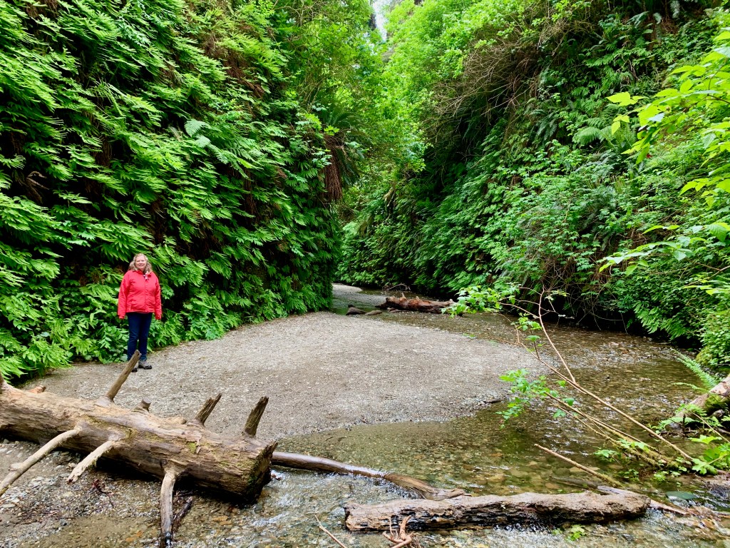 On Friday, we drove north to Prairie Creek Redwoods State Park, where we walked through Fern Canyon and along the 2.5-mile Prairie Creek and Foothills Loop Trail. Fern Canyon is such a strange and wonderful place that Stephen Spielberg filmed this dinosaur attack scene there for “Jurassic Park 2.” On our visit, it was a peaceful place—a narrow gorge with a stream flowing through it and lush ferns covering the sides.