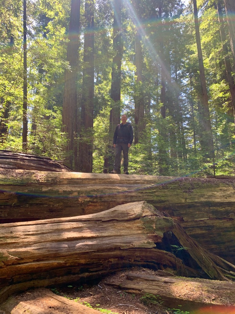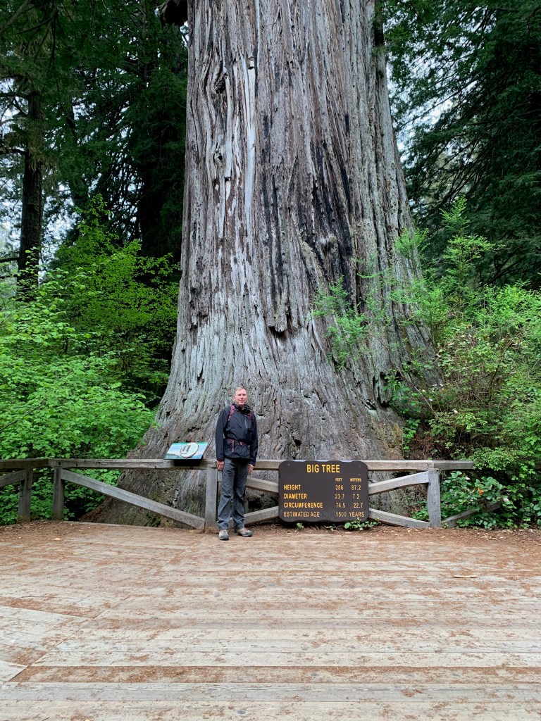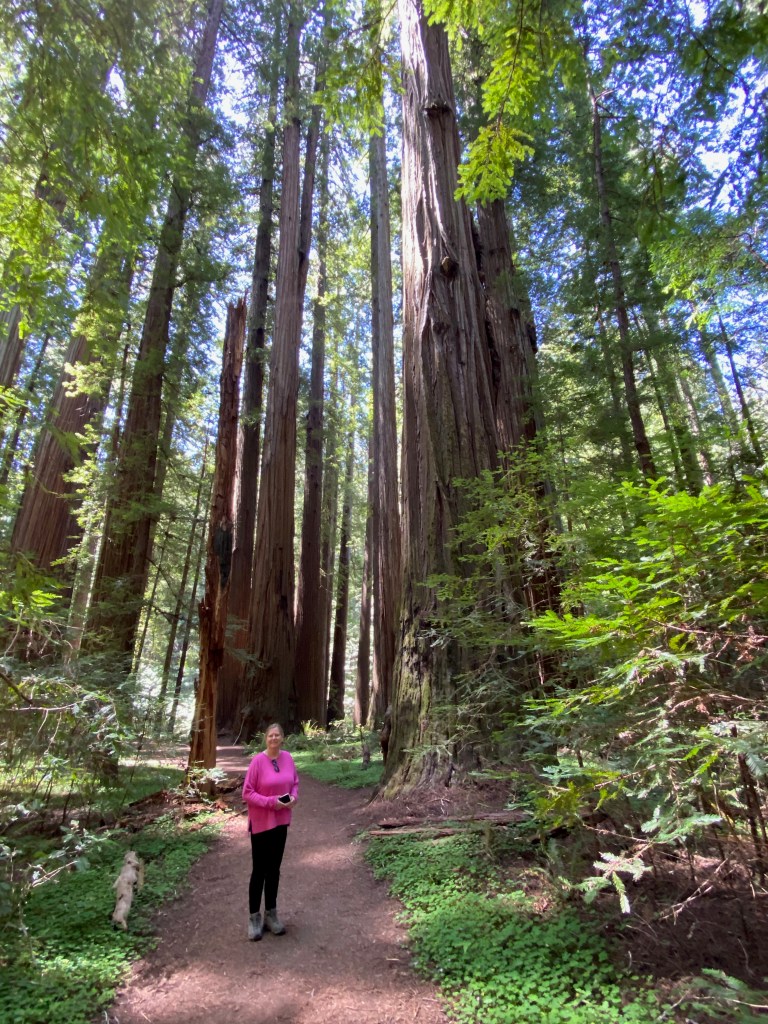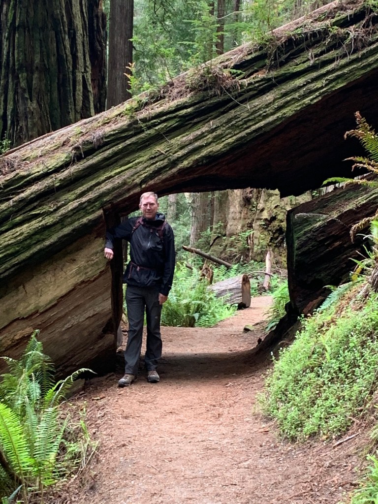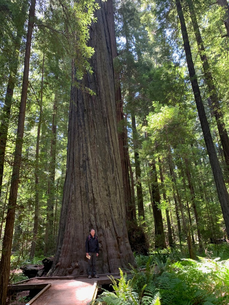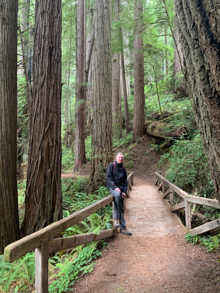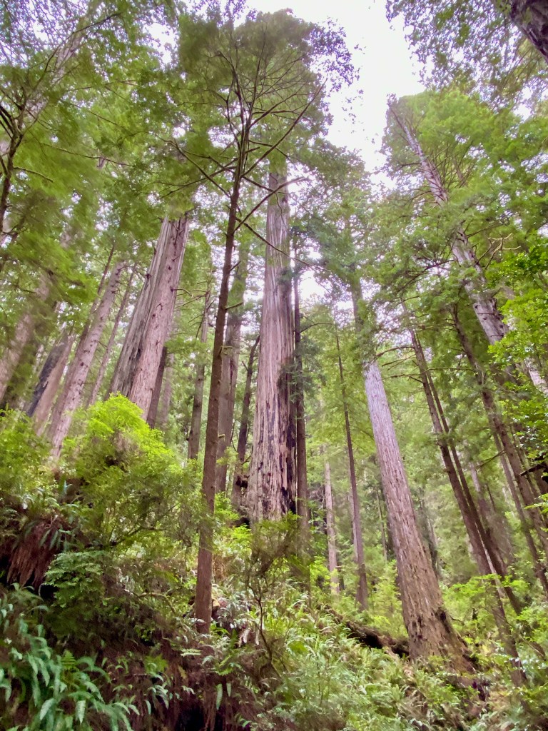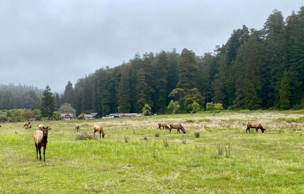 After walking on the nearby beach, we drove to another spot in the park to hike through old-growth redwood trees on the Prairie Creek and Foothills trails. As I’ve complained before, it’s impossible to capture the immensity of these trees on a camera (at least by me on an iPhone 11). The trees are so huge that they exist in three different climate zones—the shaded forest floor, the bare trunk, and the branches and green needles at the forest canopy. The park literature said a tree can give off 500 gallons of water a day, reclaiming it from the moist air from the nearby ocean. A herd of elk greeted us near the visitors center.