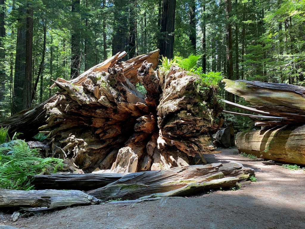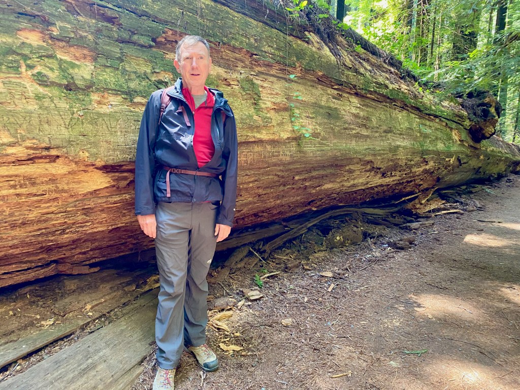 And today we drove south to the Humboldt Redwoods State Forest, where we hiked the Rockefeller Loop and the Founders Loop. We enjoyed walking along the quiet trails, with ferns growing on the forest floor and sunlight filtering through the branches of the redwoods 300 feet above us. When we weren’t looking up, we were gawking at the “fallen giants,” especially the Dyerville Giant, which fell on March 24, 1991. At the time it was at least 362 feet tall–comparable to a 30-story building–52 feet in circumference, and weighed an estimated 1 million pounds! They figure the tree was 1,600 years old, which means it began to grow as a seedling about when Augustine was writing his Confessions and City of God.