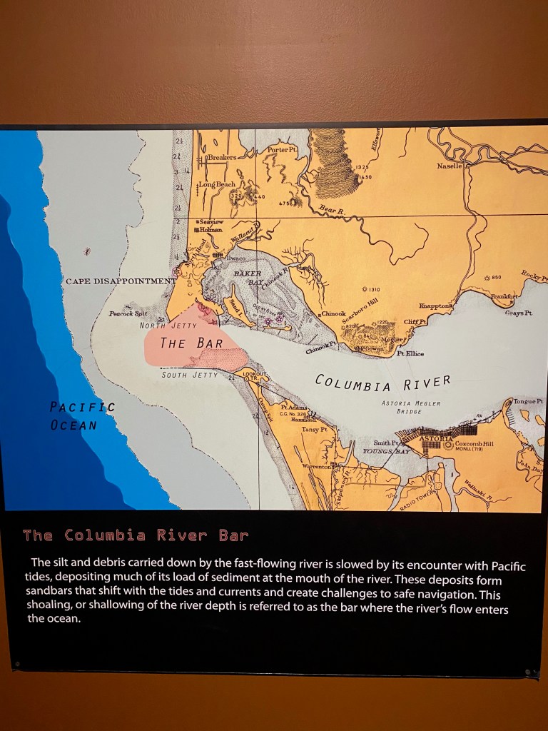 Yesterday we were back across the river in Oregon visiting another Lewis and Clark site, Fort Clatsop. This is a recreated fort on the location where the party spent the winter of 1805-06. I also toured the Columbia River Maritime Museum in Astoria, where I learned about “the Columbia River bar,” the entry point to the river where shifting sand bars and turbulent seas have made this “the Graveyard of the Pacific.” Since the early 1800s, hundreds of ships and 700 lives have been lost. On the way home we stopped at Cape Disappointment to view the lighthouse and look out across the mouth of the river.