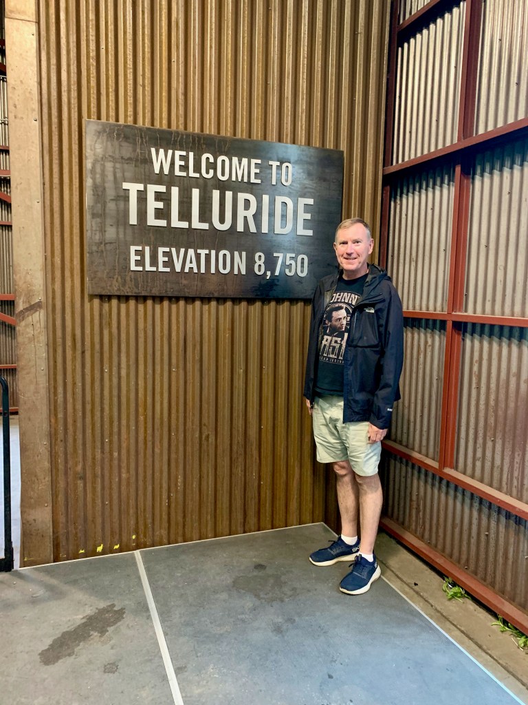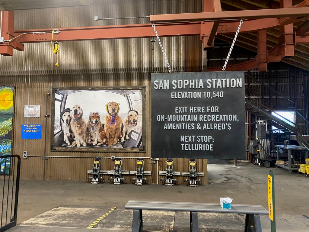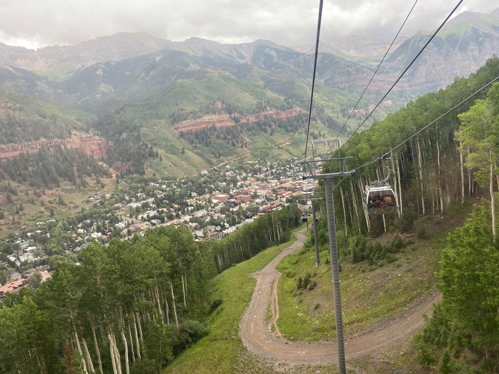 On Monday we spent most of the day in Telluride, eating lunch in town and then riding the free gondola up to the skiing area of Mountain Village. Telluride is a town of 2,000 tucked up in the San Juan Mountains at 8,750 feet above sea level. People there live in charming Victorian homes that are incredibly expensive. We didn’t meet any famous people but we did meet a famous dog! On the gondola ride, we shared our pod with a local lady and her dog, and as we passed through a station at the top of the mountain, she told us that it was her dog pictured on a giant promotional photo on the wall. (Her dog is the one on the far right, if I remember correctly.)