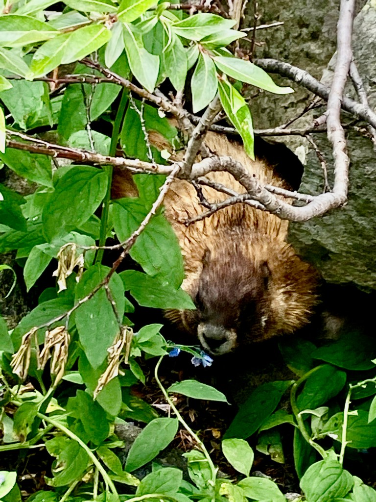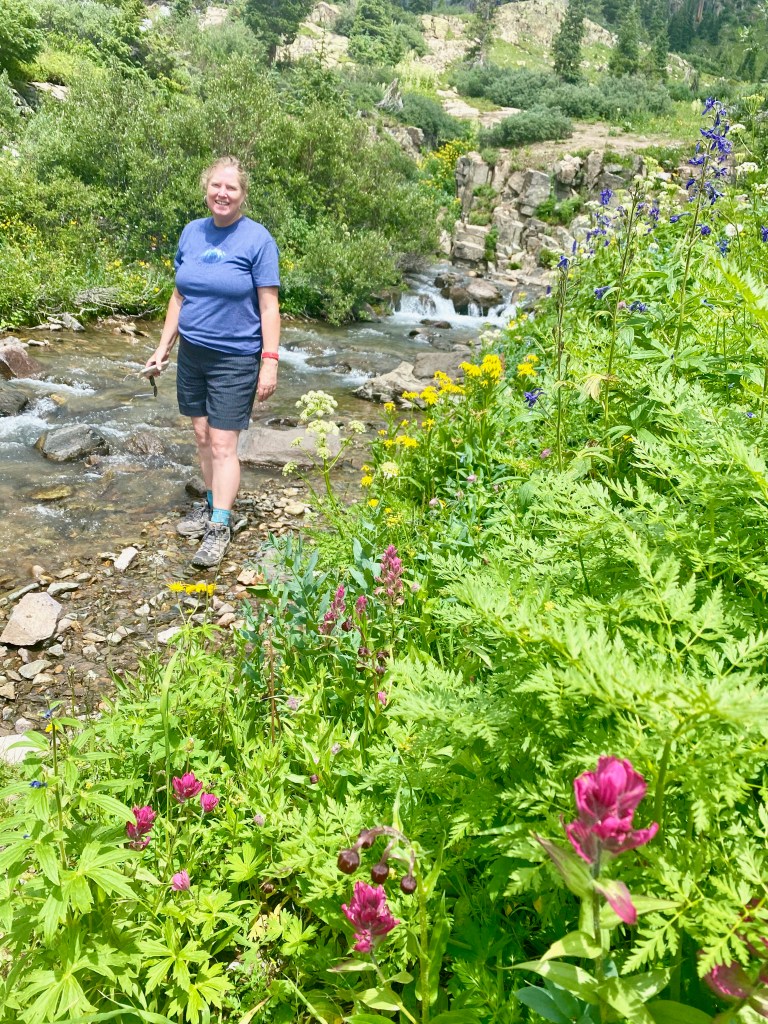 On Tuesday, we drove through Ouray on our way to Yankee Boy Basin. The basin lies above the town in the shadow of Mt. Sneffels and is accessible only by 4WD. We drove up to about 11,200 feet above sea level and enjoyed a lunch by the stream flowing down the basin. While we were eating, Elizabeth exclaimed that she could see something looking up at her from the brush below and that it had teeth. It turned out to be a harmless yellow-bellied marmot, a common animal in the high country.
