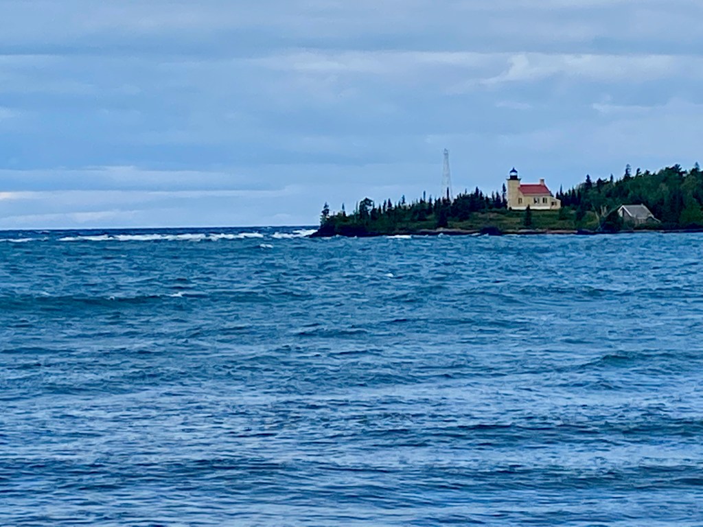 In Copper Harbor, at the top end of the Keweenaw Peninsula, we enjoyed three hikes I would recommend. On our first night there, we drove to the north terminus of US 41 and then along a gravel road to the trailhead for Horseshoe Harbor. The trail led through thick woods to a secluded bay with a rocky ridge along one side. The next day we hiked to Hunter’s Point, along Copper Harbor, with the north segment taking us along the shore of Lake Superior. Strong winds were whipping up waves that one local told us were among the largest he had ever seen. On our last full day, we biked two miles to the Estivant Pines Nature Sanctuary, which preserves an original 600-acre forest of white pines, many more than 100 feet high.