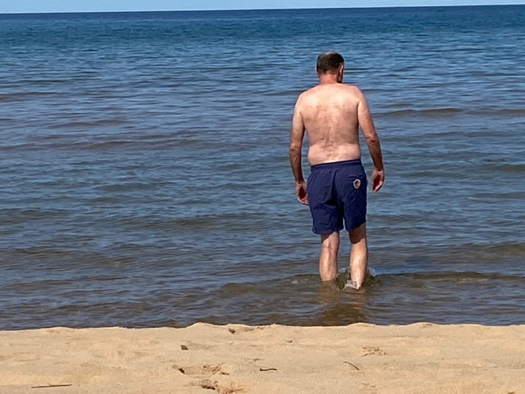 Yesterday we hauled the RV from Copper Harbor about 180 miles east to our current campsite just outside of Munising, Mich. For the next few nights we’ll be staying at the Silent Night Campground on St. Nicholas Road in Christmas, Mich. (I kid you not!) About 8 miles before our destination, we pulled over to a rest stop along a beautiful stretch of sandy beach. Lake Superior is normally cold, but this time of year its waters are relatively warm from the residual heat of summer. I said to Elizabeth, “I need to go swimming!” With the RV parked close by, I disappeared inside for a few minutes and emerged wearing my swimsuit and water shoes. The water was lovely and clear and the sandy bottom stretched out for a hundred feet from shore. Oh sublime joy!