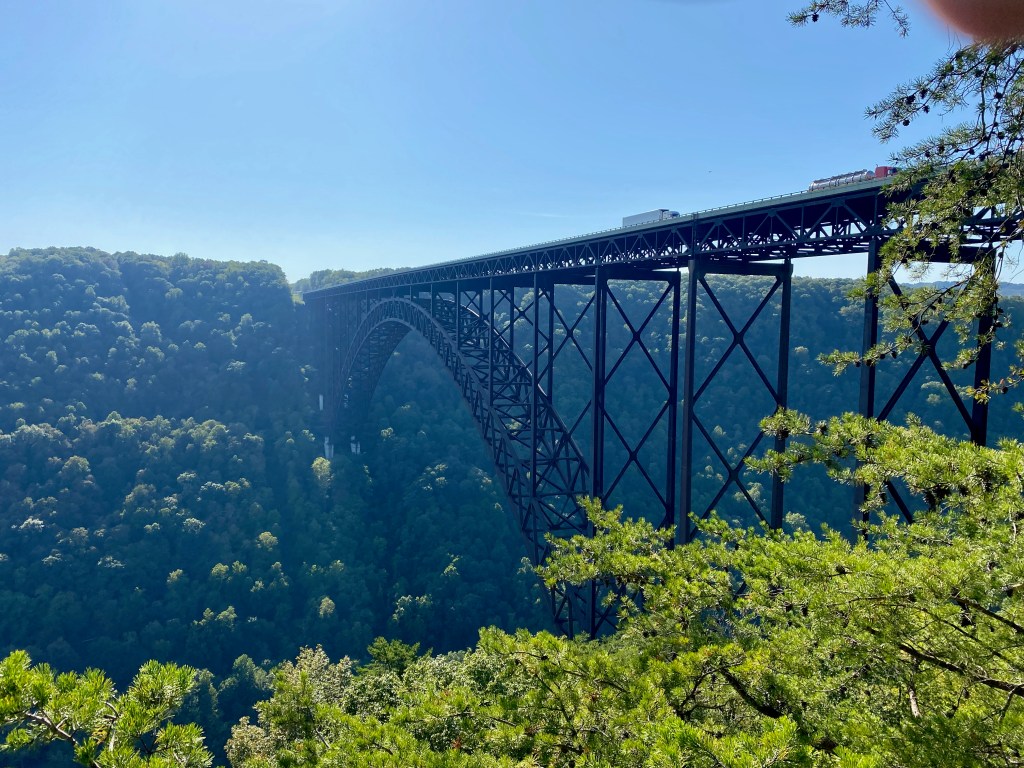 On the north end of the park, near Fayetteville, we crossed the New River Gorge Bridge and then looked up in wonder at its immense arch at the lookout at the Canyon Rim Visitor Center. Opened in 1977, the bridge is billed by the park service as “a work of structural art — the longest steel span in the western hemisphere and the third highest in the United States.” It’s the second time in two weeks that we’ve crossed a bridge billed as “the longest of its type in the hemisphere.” (The Mackinac Bridge is the other.)