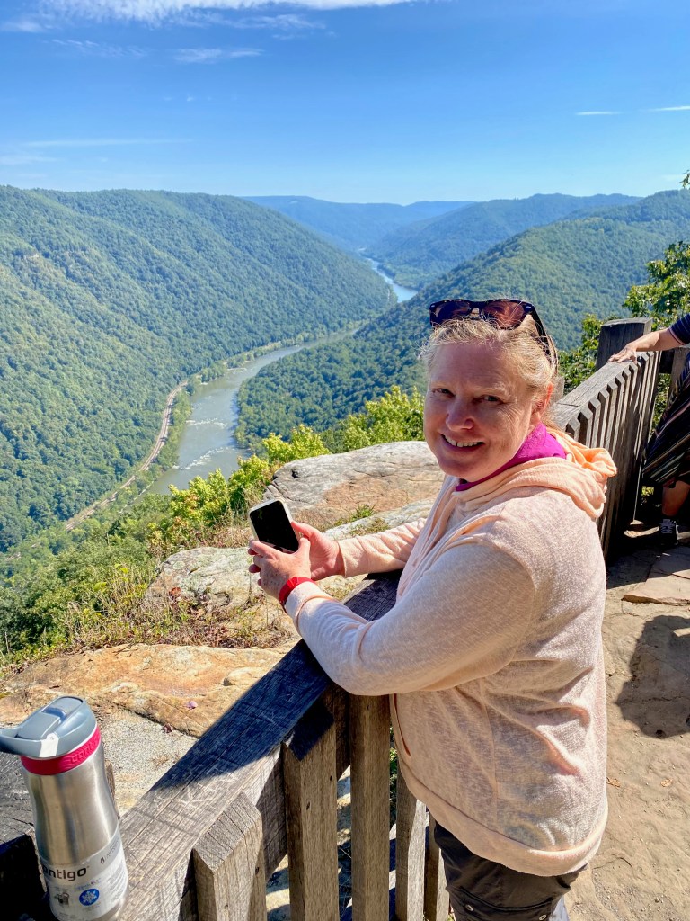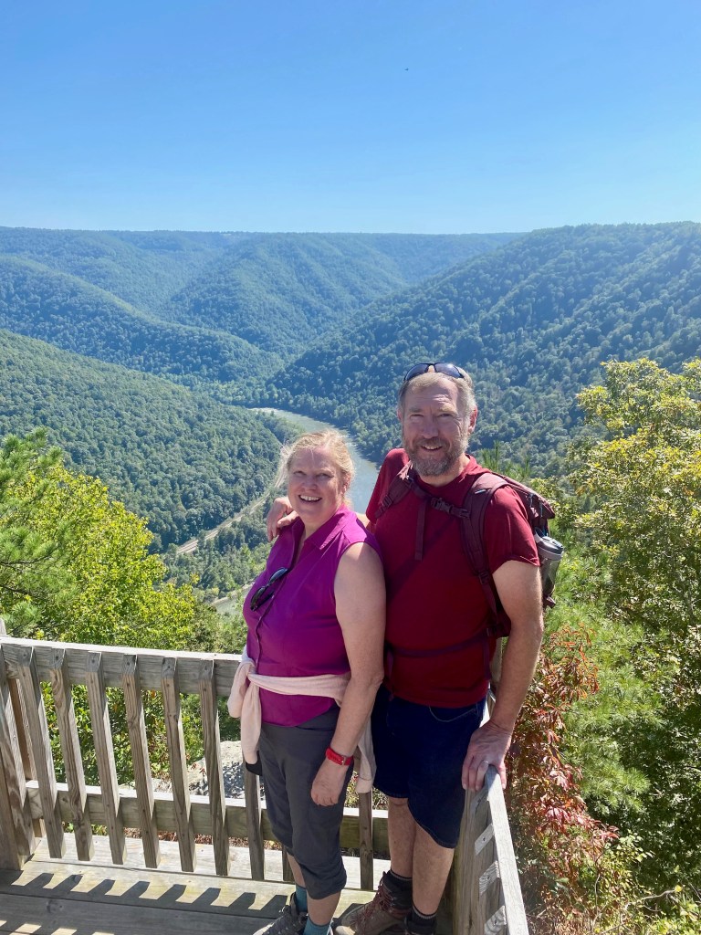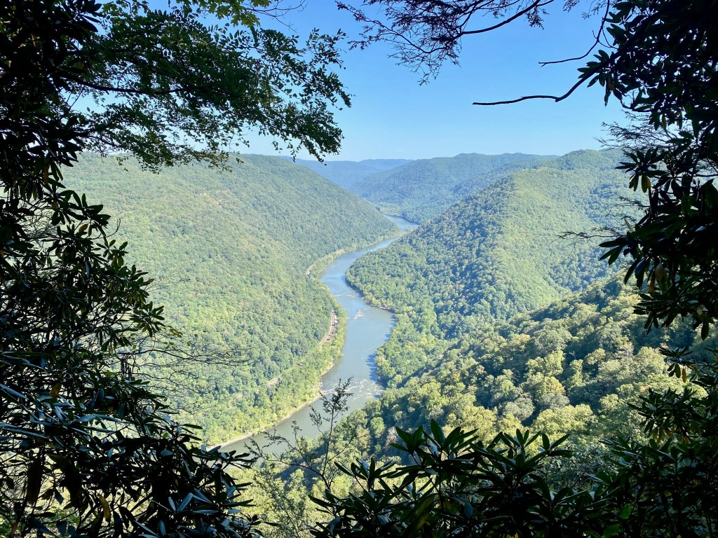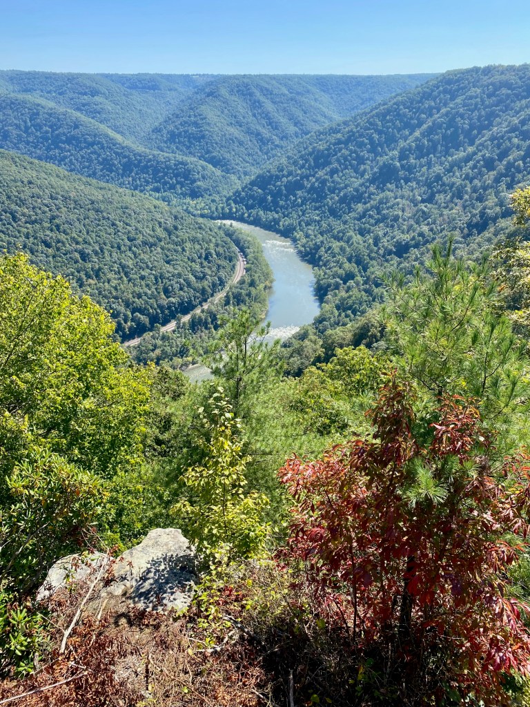 On Monday, we hiked along the rim of the New River Gorge, America’s newest national park. From the Grandview overlook, we gazed down on the river 1,400 feet below. Then we hiked 1.5 miles out and back along the Grandview Rim Trail to the Turkey Spur Overlook, where we could see the river flowing one direction before us and the other direction behind us. The Castle Rock portion of the trail took us alongside steep sandstone cliffs bending out over the trail. The day was clear and in the 70s, but shaded most of the way.