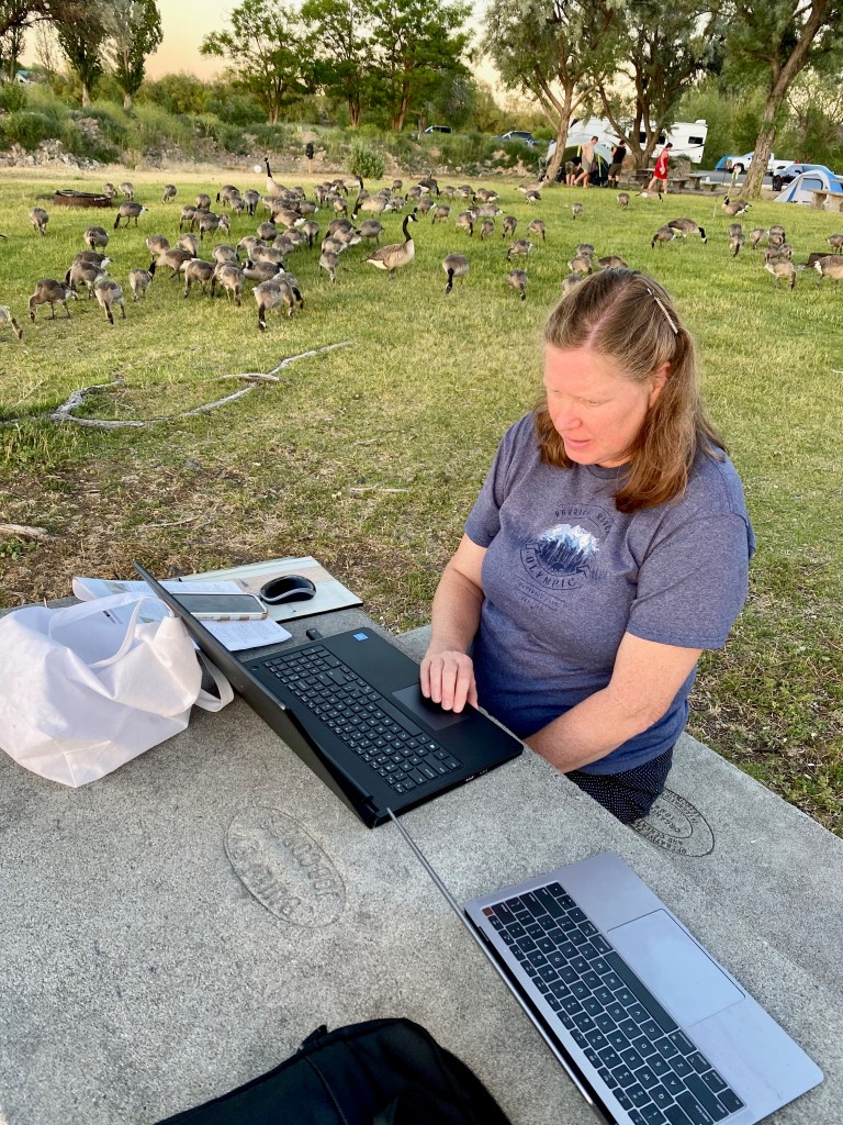 Another running issue in an RV is connectivity. Many of the places we stayed at were in beautiful natural surroundings but far from an urban area with a cellular signal. Campground wi-fi is notoriously spotty. One place told us, “Remember, this is country wi-fi,” meaning the signal was weak and prone to be overloaded. Some parks specifically prohibited streaming. We paid Verizon for a “jet pack” that converts the local cell signal into a wi-fi hotspot in our camper. But we also pay extra for the data we stream through it, which is limited and good for three or four movies at most before the monthly data allotment is used up. Often our best connection is using our iPhones as hotspots, but the data is limited there, too. As a result, we were forced in some places to travel to hill tops or parks in town to get a decent signal. (Here’s a photo I posted back in June of Elizabeth filing the church prayer list from a park in Coulee City, WA.)