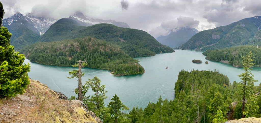 The North Cascades are called “the American Alps,” but we were only able to enjoy a small slice of the park. We hiked 1.8 miles out to a lookout called Thunder Knob above Lake Diablo. Back in the car we drove a few miles along the North Cascades Highway (U.S. 20) to a roadside lookout that offered an even better view of the lake and the surrounding mountains. The overcast day obscured the more distant peaks, but it was still a beautiful vista, as you can see from this pano shot.