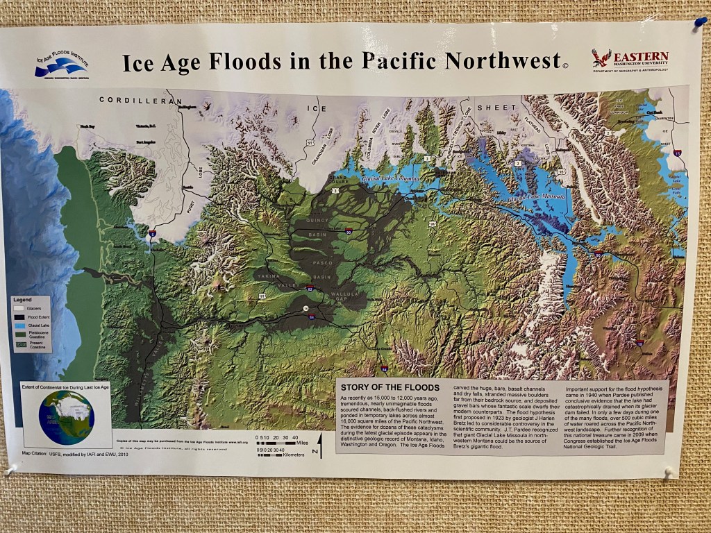 Our travels through eastern Washington have opened my eyes to the story of the massive Ice Age floods. In the early 1920s, a geologist named J. Harlen Bretz (1882-1981) began exploring the region’s strange landscape. He noticed geological features, such as deeply carved coulees, bore holes, and what he called Channeled Scabland that could only be explained by some kind of gigantic, raging flood. When Bretz published his theory, it was met with skepticism and even scorn by his fellow geologists. But he was vindicated when another geologist noted the evidence for a giant Ice Age flood originating in Montana.